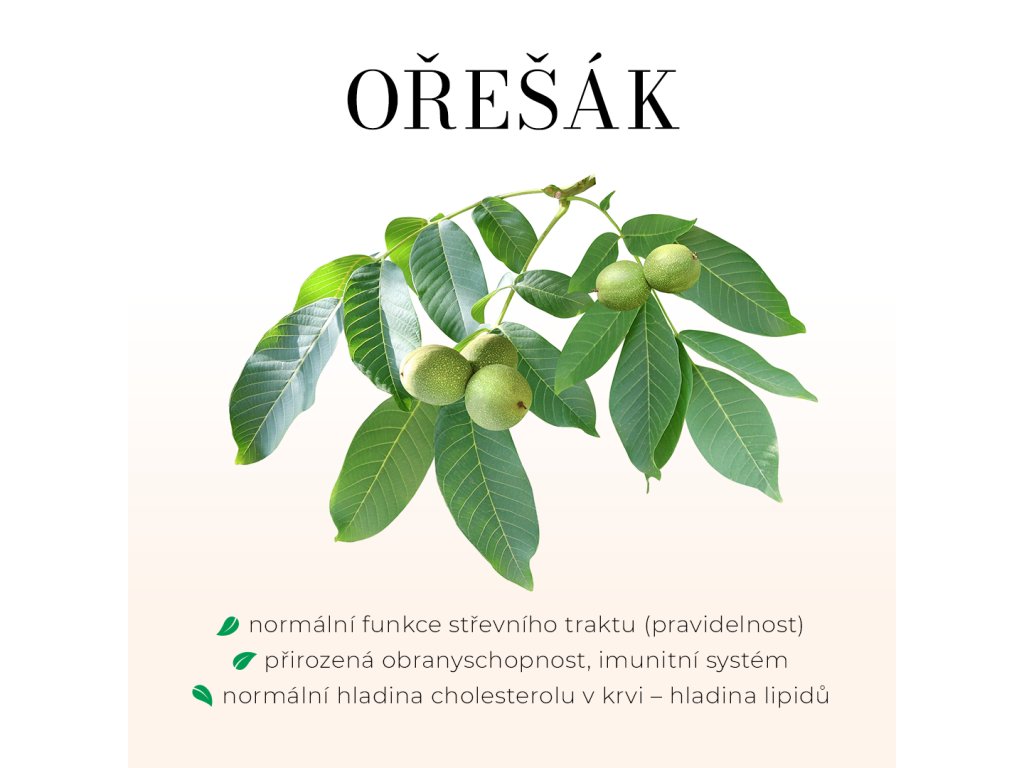 Složení: voda, jemný líh (minimálně 35 obj. % alk./ethanolu), Ořešák královský a černý (Juglans regia at nigra) standardizovaný extrakt z pupenů/ púčikov (10:1).