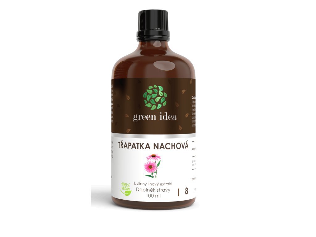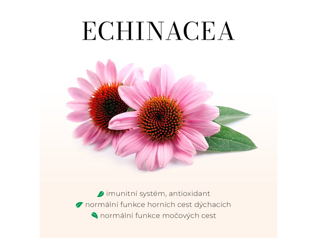 Třapatka nachová - Echinacea Purpurea: tato indiánská léčivka obsahuje nejvíce aktivních látek v kořeni. Podporuje přirozenou obranyschopnost. Podporuje správnou funkci dýchacího systému a močových cest. Jedná se o silný antioxidant.
