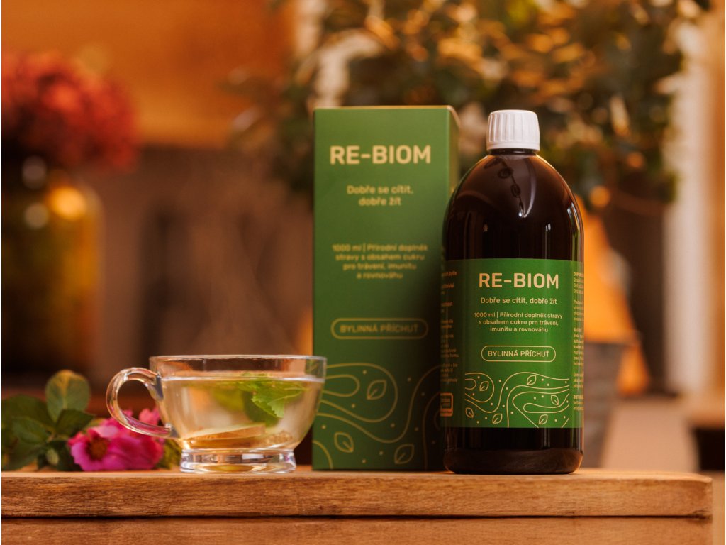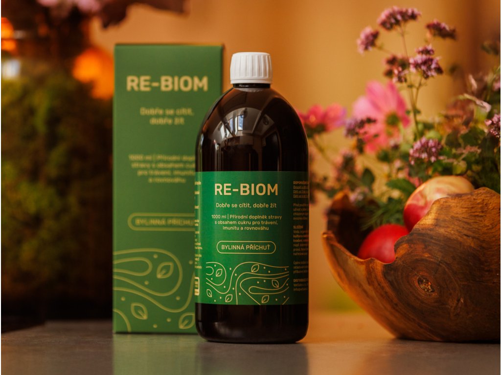 Re-BIOM je tekutý doplněk stravy s obsahem fermentovaných bylin a postbiotických složek – určený pro každodenní péči o trávení, střevní mikrobiom a vnitřní rovnováhu.